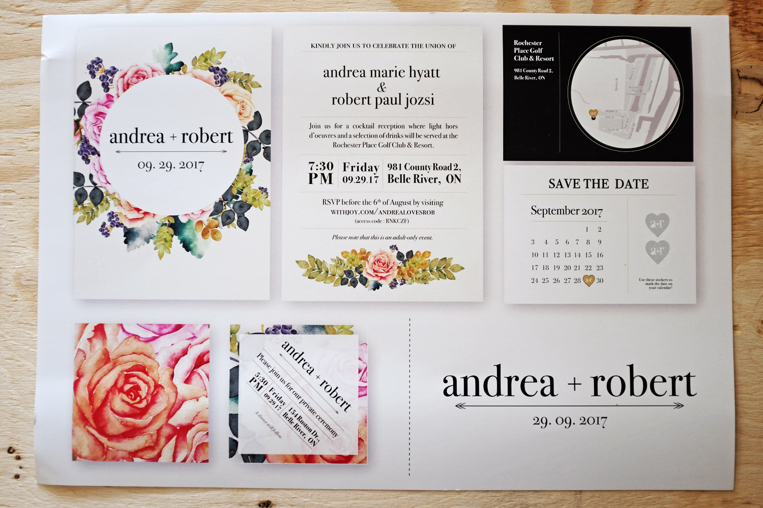 Design de logo et d’invitation de mariage. Ceci inclut une invitation générale, un faire-part (save the date), une invitation spéciale et un decalque en vinyle. En plus du design, nous avons aussi fait l’impression et la production de chaque élément.